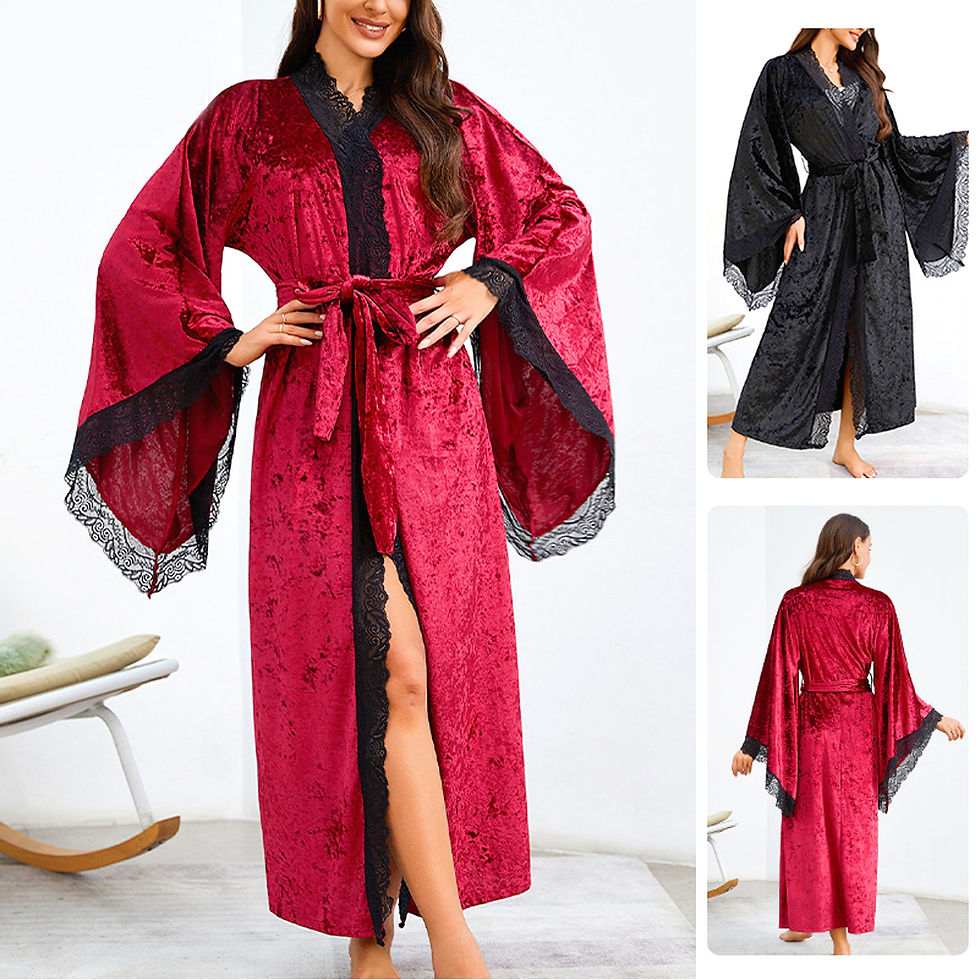 Women Velvet Nightgown Bathrobe Lace Dressing Gown Robe